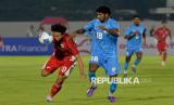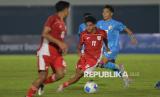 Pesepak bola Timnas Indonesia U-23 Victor Dethan berusaha melewati adangan pesepak bola Timnas India U-23 pada laga persahabatan di Stadion Madya, Kompleks GBK, Jakarta, Jumat (10/10/2025). Indonesia dikalahkan India dengan skor 1-2. (FOTO : Edwin Putranto/Republika)