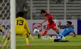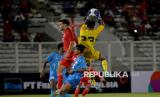 Pesepak bola Timnas Indonesia U-23 Jens Raven berduel udara dengan penjaga gawang Timnas India pada laga persahabatan di Stadion Madya, Kompleks GBK, Jakarta, Jumat (10/10/2025). Indonesia dikalahkan India dengan skor 1-2. (FOTO : Edwin Putranto/Republika)