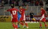 Pesepak bola Timnas Indonesia U-23 Dony Tri Pamungkas melakukan selebrasi seusai mencetak gol ke gawang India pada laga persahabatan di Stadion Madya, Kompleks GBK, Jakarta, Jumat (10/10/2025). Indonesia dikalahkan India dengan skor 1-2. (FOTO : Edwin Putranto/Republika)