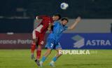 Pesepak bola Timnas Indonesia U-23 Muhammad Alfharezzi Buffon berduel udara dengan pemain Timnas India pada laga persahabatan di Stadion Madya, Kompleks GBK, Jakarta, Jumat (10/10/2025). Indonesia dikalahkan India dengan skor 1-2. (FOTO : Edwin Putranto/Republika)