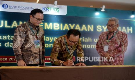 Presiden Direktur PT Bank Aladin Syariah Tbk Koko Tjatur Rachmadi (kanan) menyaksikan penandatanganan nota kesepahaman yang ditandatangani oleh Direktur Utama PT Bakerindo Sukses Makmur Dhoya Satyabima Sugarda (kiri) dan Direktur PT Bank Aladin Syariah Tbk Jo Anula Putra saat acara Business and Financing Deals di arena Indonesia Sharia Economic Festival (ISEF) 2025, Jakarta, Jumat (10/10/2025). Dalam kegiatan Business and Financing Deals yang menjadi bagian dari puncak Bulan Pembiayaan Syariah, Bank Aladin Syariah melaksanakan prosesi akad pembiayaan korporasi bersama PT Bakerindo Sukses Bersama dan PT Anugerah Sejati Laras. Kedua perusahaan tersebut merupakan pelaku usaha halal di sektor riil yang bergerak di bidang makanan, minuman (F&B), dan kecantikan, dengan total nilai pembiayaan mencapai Rp19 miliar. (FOTO : Dok Republika)