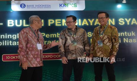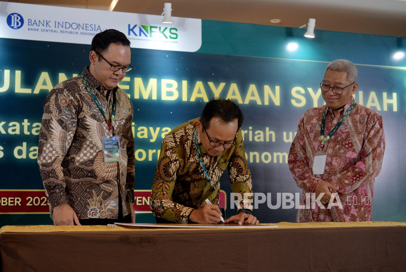 Presiden Direktur PT Bank Aladin Syariah Tbk Koko Tjatur Rachmadi (kiri), Direktur Utama PT Bakerindo Sukses Makmur Dhoya Satyabima Sugarda (tengah) dan Direktur PT Bank Aladin Syariah Tbk Jo Anula Putra saat acara Business and Financing Deals di arena Indonesia Sharia Economic Festival (ISEF) 2025, Jakarta, Jumat (10/10/2025). Dalam kegiatan Business and Financing Deals yang menjadi bagian dari puncak Bulan Pembiayaan Syariah, Bank Aladin Syariah melaksanakan prosesi akad pembiayaan korporasi bersama PT Bakerindo Sukses Bersama dan PT Anugerah Sejati Laras. Kedua perusahaan tersebut merupakan pelaku usaha halal di sektor riil yang bergerak di bidang makanan, minuman (F&B), dan kecantikan, dengan total nilai pembiayaan mencapai Rp19 miliar. (FOTO : Dok Republika)