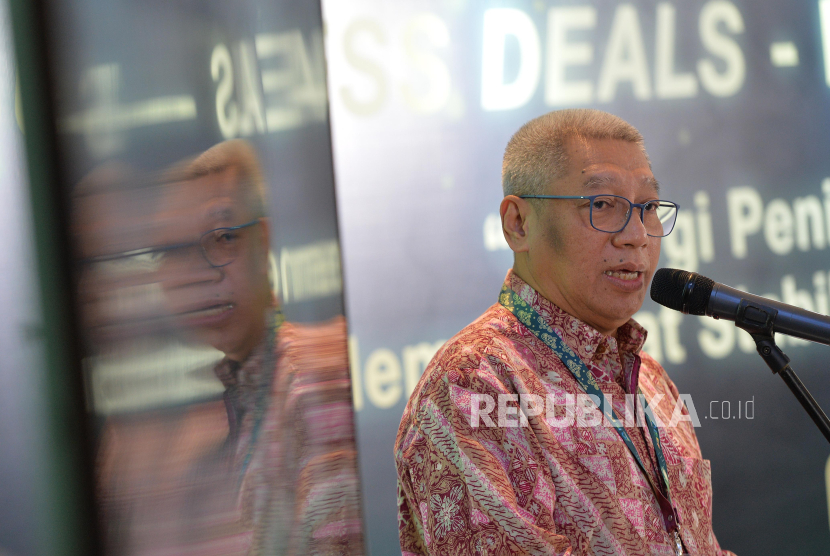 Presiden Direktur PT Bank Aladin Syariah Tbk Koko Tjatur Rachmadi memberikan sambutan saat acara Business and Financing Deals di arena Indonesia Sharia Economic Festival (ISEF) 2025, Jakarta, Jumat (10/10/2025). Dalam kegiatan Business and Financing Deals yang menjadi bagian dari puncak Bulan Pembiayaan Syariah, Bank Aladin Syariah melaksanakan prosesi akad pembiayaan korporasi bersama PT Bakerindo Sukses Bersama dan PT Anugerah Sejati Laras. Kedua perusahaan tersebut merupakan pelaku usaha halal di sektor riil yang bergerak di bidang makanan, minuman (F&B), dan kecantikan, dengan total nilai pembiayaan mencapai Rp19 miliar. (FOTO : Dok Republika)
