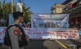 Polisi berjaga saat warga memblokade jalan utama Jambula dalam aksi protes di Ternate, Maluku Utara, Senin (13/10/2025). Lembaga Pemberdayaan Masyarakat (LPM), pemuda, nelayan dan warga setempat menggelar aksi tutup jalan memprotes lambannya pembangunan pemecah gelombang dan perbaikan jalan yang rusak akibat hantaman ombak pada Selasa (7/10) sehingga membuat banyak nelayan tidak bisa melaut karena kehilangan alat transportasi utama mereka. (FOTO : ANTARA FOTO/Andri Saputra)