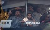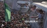 Tahanan Palestina yang dibebaskan oleh Israel tiba di Khan Younis, Jalur Gaza, Senin (13/10/2025). Israel membebaskan 1.966 warga Palestina yang menjadi tahanan. Warga Palestina dibebaskan dari penjara-penjara Israel sebagai bagian dari kesepakatan gencatan senjata dengan kelompok perlawanan Hamas. Sebaliknya Hamas juga membebaskan tahanan Israel. (FOTO : REUTERS/Ramadan Abed)