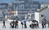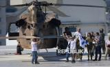 Sandera Israel yang dibebaskan dari Jalur Gaza memegang bendera Israel setelah turun dari helikopter di Rumah Sakit Ichilov, di Tel Aviv, Israel, Senin (13/10/2025). Hamas membebaskan tahanan Israel sebagai bagian dari kesepakatan gencatan senjata. (FOTO : AP Photo/Ohad Zwigenberg)