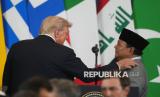 Presiden Donald Trump bersama Presiden Prabowo Subianto saat menghadiri KTT perdamaian Timur Tengah di Sharm el-Sheikh, Mesir, Senin (13/10/2025). Presiden RI Prabowo Subianto turut menjadi saksi penandatanganan dokumen gencatan senjata Gaza dalam KTT perdamaian Timur Tengah. Penandatanganan itu dilakukan oleh Presiden AS Donald Trump bersama sejumlah mediator seperti Qatar, Mesir, dan Turki. (FOTO : AP Photo/Amr Nabil)