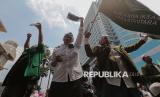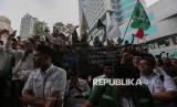 Massa dari Pengurus Wilayah Nahdlatul Ulama (PWNU) DKI Jakarta dan sejumlah alumni pondok pesantren saat Aksi Bela Ulama dan Pesantren di depan gedung Transmedia, Jakarta, Rabu (15/10/2025). Dalam aksinya mereka menuntut pihak Trans7 untuk bertanggung jawab atas tayangan program Xpose Uncensored pada tanggal 13 Oktober di stasiun televisi Trans7 yang dianggap melecehkan tradisi pondok pesantren, santri, dan para kiai. (FOTO : Republika/Thoudy Badai)