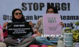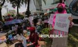 Peserta aksi yang tergabung dari Suara Ibu Indonesia menggelar aksi Tolak MBG di depan Gedung Badan Gizi Nasional (BGN), Jakarta, Rabu (15/10/2025). Dalam aksinya mereka menyuarakan penolakan terhadap program Makan Bergizi Gratis (MBG) yang digagas pemerintah setelah banyak kasus korban keracunan di berbagai daerah. Mereka menuntut pemerintah untuk segera mengevaluasi secara menyeluruh program tersebut. Diantaranya penyaluran MBG dilakukan secara bertahap dan dimulai dari keluarga pra-sejahtera agar tepat sasaran, prioritas penyaluran MBG kepada keluarga di desa dan perkotaan yang rentan krisis pangan dan gizi hingga transparansi program yang melibatkan masyarakat sipil sebagai pengawas independen untuk meminimalisir praktik KKN dalam program tersebut. (FOTO : Republika/Thoudy Badai)
