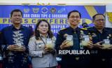 Kepala Kantor Bea Cukai Soekarno-Hatta Gatot Sugeng Wibowo (kedua kanan) didampingi Kepala Balai Karantina Hewan, Ikan dan Tumbuhan Banten Duma Sari (kedua kiri), Ketua Tim Kerja Penanganan Pelanggaran Pangkalan Pengawasan Sumber Daya Kelautan dan Perikanan (PSDKP) Jakarta Yogi Darmawan Effendi (kanan) dan perwakilan dari Direktorat 32 BIN Liliek Gatot Suhendro (kiri) menunjukkan barang bukti benih bening lobster (BBL) saat ungkap kasus di Kantor Bea Cukai Bandara Soekarno-Hatta, Kota Tangerang, Banten, Kamis (16/10/2025). Bea Cukai Bandara Soekarno-Hatta bekerja sama dengan Badan Karantina Indonesia berhasil menggagalkan upaya penyelundupan ekspor BBL senilai Rp5,17 miliar dengan mengamankan empat tersangka beserta barang bukti berupa delapan buah koper berisi 172 kemasan benih lobster dengan total sebanyak 172.611 ekor untuk dikirim ke Singapura. (FOTO : ANTARA FOTO/Putra M. Akbar)