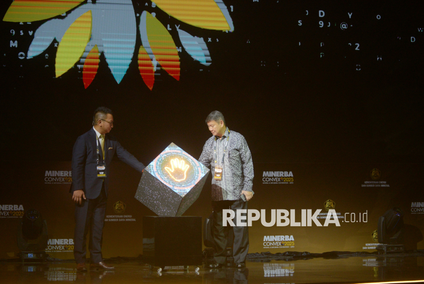 Komisaris Utama Arsari Tambang Hashim Djojohadikusumo bersama Presiden Direktur Arsari Tambang Aryo Djojohadikusumo bersiap meluncurkan produk timah ramah lingkungan bernama Envirotin pada ajang Mineral dan Batu bara Convention Expo (Minerba Convex) 2025 di Jakarta International Convention Center (JICC), Jakarta, Rabu (15/10/2025). Melalui PT Arsari Tambang, bagian dari Arsari Group, perusahaan meluncurkan produk timah ramah lingkungan bernama Envirotin yang diklaim diproduksi dengan teknologi rendah karbon dan berbasis energi terbarukan. Arsari Group berharap peluncuran Envirotin dapat menjadi langkah nyata menuju hilirisasi industri mineral yang berkelanjutan dan mendukung visi Inovasi Hijau, Indonesia Maju. (FOTO : Republika/Prayogi)