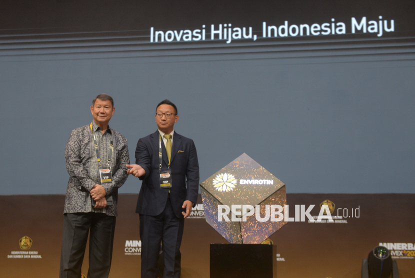Komisaris Utama Arsari Tambang Hashim Djojohadikusumo bersama Presiden Direktur Arsari Tambang Aryo Djojohadikusumo saat meluncurkan produk timah ramah lingkungan bernama Envirotin pada ajang Mineral dan Batu bara Convention Expo (Minerba Convex) 2025 di Jakarta International Convention Center (JICC), Jakarta, Rabu (15/10/2025). Melalui PT Arsari Tambang, bagian dari Arsari Group, perusahaan meluncurkan produk timah ramah lingkungan bernama Envirotin yang diklaim diproduksi dengan teknologi rendah karbon dan berbasis energi terbarukan. Arsari Group berharap peluncuran Envirotin dapat menjadi langkah nyata menuju hilirisasi industri mineral yang berkelanjutan dan mendukung visi Inovasi Hijau, Indonesia Maju. (FOTO : Republika/Prayogi)