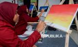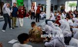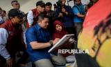 REPUBLIKA.CO.ID, TANGSEL -- Sekretaris Kabinet yang juga Duta Sekolah Rakyat Teddy Indra Wijaya menorehkan kuas pada kanvas lukisan disaksikan Menteri Sosial Saifullah Yusuf dan Wakil Menteri Sosial Agus Jabo saat pentas seni sekolah rakyat di Sekolah Rakyat Menengah Atas (SRMA) 33 Tangerang Selatan, Banten, Ahad (19/10/2025).