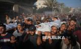 Warga mengusung jenazah saat pemakaman warga Palestina yang tewas akibat tembakan Israel, di Deir al-Balah, Jalur Gaza, Ahad (19/10/2025). Sumber-sumber medis melaporkan bahwa lebih dari 40 orang gugur syahid dan puluhan lainnya terluka di seluruh Jalur Gaza Palestina akibat serangan Israel yang menargetkan tenda dan sekolah yang menaungi para pengungsi, serta gedung tempat para jurnalis bekerja. (FOTO : AP Photo/Abdel Kareem Hana)