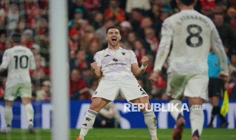 Pemain Manchester United Diogo Dalot melakukan selebrasi seusai mengalahkan Liverpool pada pertandingan sepak bola Liga Primer Inggris di Liverpool, Ahad (19/10/2025) waktu setempat. Manchester United mengalahkan Liverpool dengan skor 2-1. United unggul cepat lewat gol Bryan Mbeumo pada menit kedua, tapi sempat disamakan oleh Cody Gakpo menit ke-78. Gol sundulan Harry Maguire pada menit 84 memastikan kemenangan bagi setan merah. (FOTO : AP Photo/Ian Hodgson)