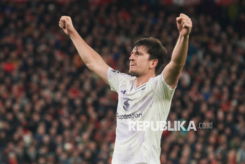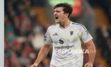 Pemain Manchester United Harry Maguire melakukan selebrasi seusai mengalahkan Liverpool pada pertandingan sepak bola Liga Primer Inggris di Liverpool, Ahad (19/10/2025) waktu setempat. Manchester United mengalahkan Liverpool dengan skor 2-1. United unggul cepat lewat gol Bryan Mbeumo pada menit kedua, tapi sempat disamakan oleh Cody Gakpo menit ke-78. Gol sundulan Harry Maguire pada menit 84 memastikan kemenangan bagi setan merah. (FOTO : AP Photo/Ian Hodgson)