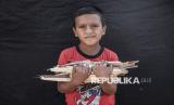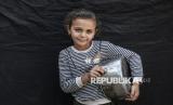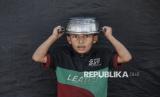 Seorang anak Palestina membawa panci kosong di Kamp Pengungsi Bureij, Gaza, Ahad (19/10/2025). Anak-anak Palestina di Gaza telah kehilangan hak-hak dasar mereka seperti pendidikan dan bermain. (FOTO : Moiz Salhi/Anadolu via Reuters)