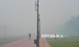 Warga berolahraga di tengah kabut asap yang menyelimuti New Delhi, India, Selasa (21/10/2025). Kabut asap tebal menyelimuti New Delhi, sehari setelah jutaan orang merayakan festival Diwali dengan kembang api yang menyebabkan tingkat polusi udara melonjak. Indeks kualitas udara (AQI) di New Delhi tercatat berada di angka 350, tingkat yang dianggap parah dan berbahaya untuk dihirup. Jarak pandang menurun di beberapa bagian kota saat kabut abu-abu menyelimuti jalan, gedung tinggi, dan monumen bersejarah. New Delhi yang dihuni lebih dari 30 juta jiwa, secara rutin menempati peringkat sebagai kota paling tercemar di dunia. (FOTO : AP Photo/Manish Swarup)