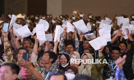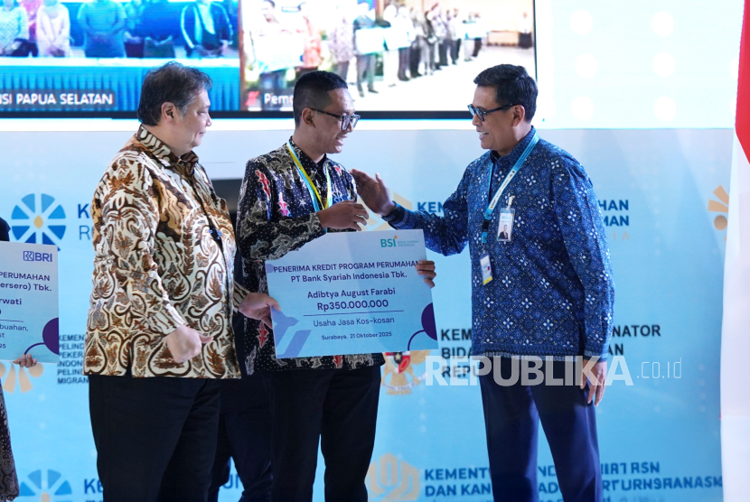 REPUBLIKA.CO.ID, SURABAYA Menteri Koordinator Bidang Perekonomian Airlangga Hartanto bersama Direktur Utama BSI Anggoro Eko Cahyo menyerahkan secara simbolis KUR Syariah kepada nasabah saat Akad Massal Kredit Usaha Rakyat (KUR) 800.000 Debitur, Penciptaan Lapangan Kerja dan Peluncuran Kredit Program Perumahan (KPP) di Dyandra Convention Center, Surabaya, Jawa Timur, Selasa (21/10/2025).