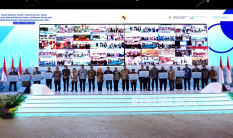 Menteri Koordinator Bidang Perekonomian Airlangga Hartanto berfoto bersama saat Akad Massal Kredit Usaha Rakyat (KUR) 800.000 Debitur, Penciptaan Lapangan Kerja dan Peluncuran Kredit Program Perumahan (KPP) di Dyandra Convention Center, Surabaya, Jawa Timur, Selasa (21/10/2025). PT Bank Syariah Indonesia Tbk (BSI) konsisten berkontribusi terhadap pertumbuhan ekonomi nasional melalui penguatan sektor UMKM. Hal ini dituangkan dalam penandatanganan akad KUR massal sebanyak 800 ribu UMKM di Surabaya yang diikuti secara daring di 38 provinsi seluruh Indonesia. (FOTO : Dok Republika)