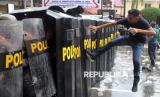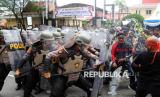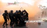 REPUBLIKA.CO.ID, DUMAI -- Pengunjuk rasa berusaha menerobos barikade polisi saat simulasi latihan pengamanan unjuk rasa di depan Markas Kepolisan Resor (Mapolres) Dumai, Riau, Selasa (21/10/2025).