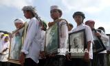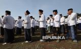 Sejumlah santri berdoa saat mengikuti apel Hari Santri Nasional di Pondok Pesantren Lirboyo, Kota Kediri, Jawa Timur, Rabu (22/10/2025). Peringatan Hari Santri Nasional dengan tema Mengawal Indonesia Merdeka Menuju Peradaban Dunia tersebut diikuti oleh ribuan santri Lirboyo. (FOTO : ANTARA FOTO/Prasetia Fauzani)
