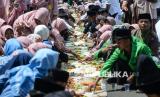 Sejumlah santri memakan nasi murak liwet di Rangkasbitung, Lebak, Banten, Rabu (22/10/2025). Murak liwet yang merupakan bagian tradisi makan bersama dari Pesantren Salafi tersebut diikuti oleh ribuan santri dalam rangka memeriahkan Hari Santri Nasional 2025 sekaligus menjadi ajang silaturahim sesama santri. (FOTO : ANTARA FOTO/Muhammad Bagus Khoirunas)