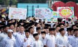 Sejumlah santri membawa poster saat mengikuti apel Hari Santri Nasional 2025 di Taman Elektrik, Kota Tangerang, Banten, Rabu (22/10/2025). Apel yang diikuti ribuan santri dari berbagai pesantren dan perguruan Islam tersebut dalam rangka memperingati Hari Santri Nasional 2025 bertema Mengawal Indonesia Merdeka, Menuju Peradaban Dunia. (FOTO : ANTARA FOTO/Putra M. Akbar)
