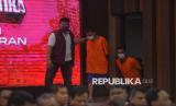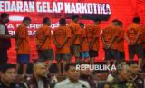 Para tersangka dihadirkan saat rilis pengungkapan peredaran gelap narkotika oleh Dittipidnarkoba Bareskrim Polri bersama Ditresnarkoba Polda jajaran di Gedung Bareskrim Polri, Jakarta, Rabu (22/10/2025). Direktorat Tindak Pidana Narkoba (Dittipidnarkoba) Bareskrim Polri beserta Direktorat Reserse Narkoba Polda jajaran mengungkap 38.934 kasus peredaran narkoba sepanjang Januari hingga Oktober 2025. Adapun total barang bukti narkotika yang disita dari para tersangka sebanyak 197,71 ton. (FOTO : Republika/Prayogi)