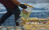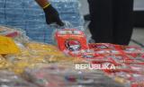 Petugas menaruh Bbrang bukti narkotika yang diperlihatkan saat rilis pengungkapan peredaran gelap narkotika oleh Dittipidnarkoba Bareskrim Polri bersama Ditresnarkoba Polda jajaran di Gedung Bareskrim Polri, Jakarta, Rabu (22/10/2025). Direktorat Tindak Pidana Narkoba (Dittipidnarkoba) Bareskrim Polri beserta Direktorat Reserse Narkoba Polda jajaran mengungkap 38.934 kasus peredaran narkoba sepanjang Januari hingga Oktober 2025. Adapun total barang bukti narkotika yang disita dari para tersangka sebanyak 197,71 ton. (FOTO : Republika/Prayogi)