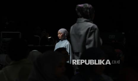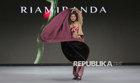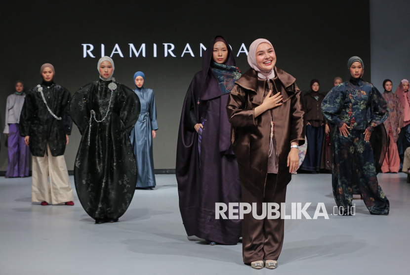 Desainer Ria Miranda menyapa tamu undangan usai peragaan busana karyanya bertajuk Juxtaposed dalam gelaran The Langham Fashion Soiree 2025 di Hotel The Langham, Jakarta, Rabu (22/10/2025). Dalam gelaran tersebut, Ria Miranda menghadirkan sebanyak 32 koleksi busana bertajuk Juxtaposed yang terinspirasi dari fase-fase kehidupan manusia dengan menyandingkan kontras kehidupan dikemas melalui kompleksitas pola yang tampak sederhana namun memiliki detail yang kompleks. (FOTO : Republika/Thoudy Badai)