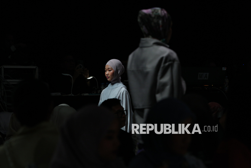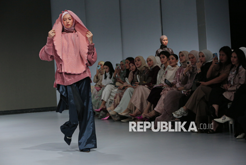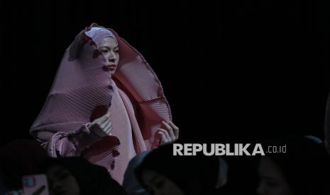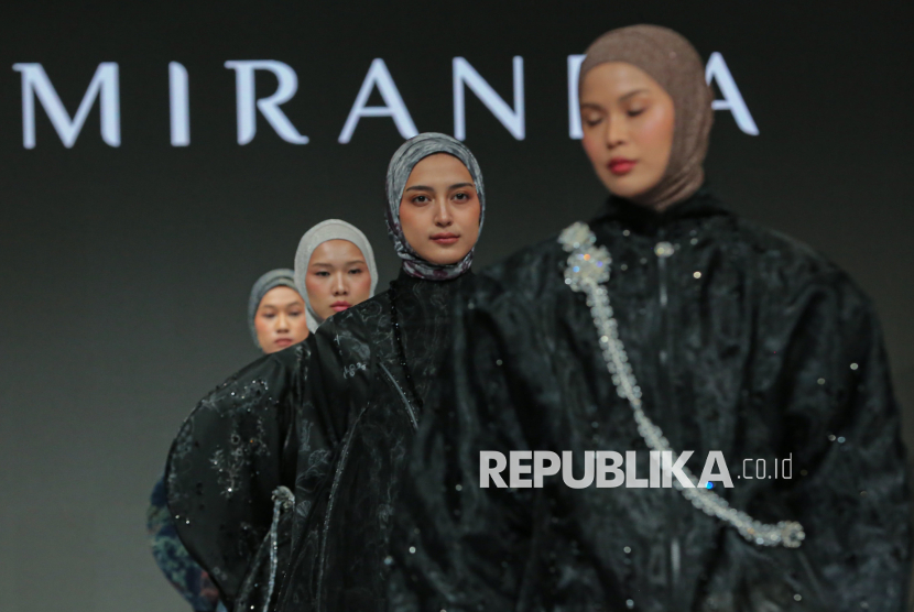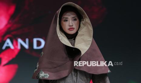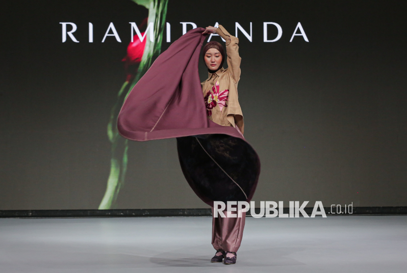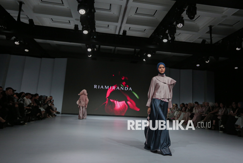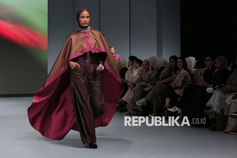 Model memperagakan busana karya desainer Ria Miranda bertajuk Juxtaposed dalam gelaran The Langham Fashion Soiree 2025 di Hotel The Langham, Jakarta, Rabu (22/10/2025). Dalam gelaran tersebut, Ria Miranda menghadirkan sebanyak 32 koleksi busana bertajuk Juxtaposed yang terinspirasi dari fase-fase kehidupan manusia dengan menyandingkan kontras kehidupan dikemas melalui kompleksitas pola yang tampak sederhana namun memiliki detail yang kompleks. (FOTO : Republika/Thoudy Badai)