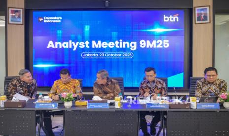 Direktur Utama PT Bank Tabungan Negara (Persero) Tbk Nixon LP Napitupulu memberikan paparan mengenai kinerja BTN saat Analyst Meeting di Jakarta, Kamis (23/10/2025). Pada kuartal III/2025, BTN berhasil membukukan laba bersih sebesar Rp2,3 triliun, tumbuh sebesar 10,6 persen secara tahunan (yoy) dibandingkan periode yang sama tahun lalu. Kredit dan pembiayaan BTN juga tercatat tumbuh positif sebesar 7,0 persen yoy menjadi Rp381,03 triliun. (FOTO : Dok Republika)