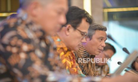 Direktur Utama PT Bank Tabungan Negara (Persero) Tbk Nixon LP Napitupulu berbincang bersama jajaran direksi saat Analyst Meeting BTN di Jakarta, Kamis (23/10/2025). Pada kuartal III/2025, BTN berhasil membukukan laba bersih sebesar Rp2,3 triliun, tumbuh sebesar 10,6 persen secara tahunan (yoy) dibandingkan periode yang sama tahun lalu. Kredit dan pembiayaan BTN juga tercatat tumbuh positif sebesar 7,0 persen yoy menjadi Rp381,03 triliun. (FOTO : Dok Republika)