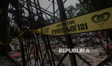 Garis polisi melintang di reruntuhan Pasar Taman Puring yang hangus terbakar di Jakarta, Kamis (23/10/2025). Pascakebakaran pada bulan Juli 2025 lalu, revitalisasi Pasar Taman Puring tak kunjung diperbaiki. Menurut Gubernur DKI Jakarta Pramono Anung, pasar tersebut akan segera direvitalisasi setelah ada kesepakatan diantara seluruh pedagang, agar proses revitalisasi dapat berjalan dengan lancar. (FOTO : Republika/Thoudy Badai)