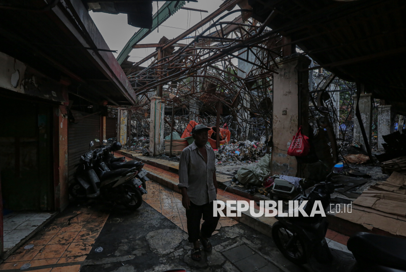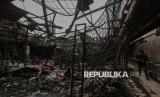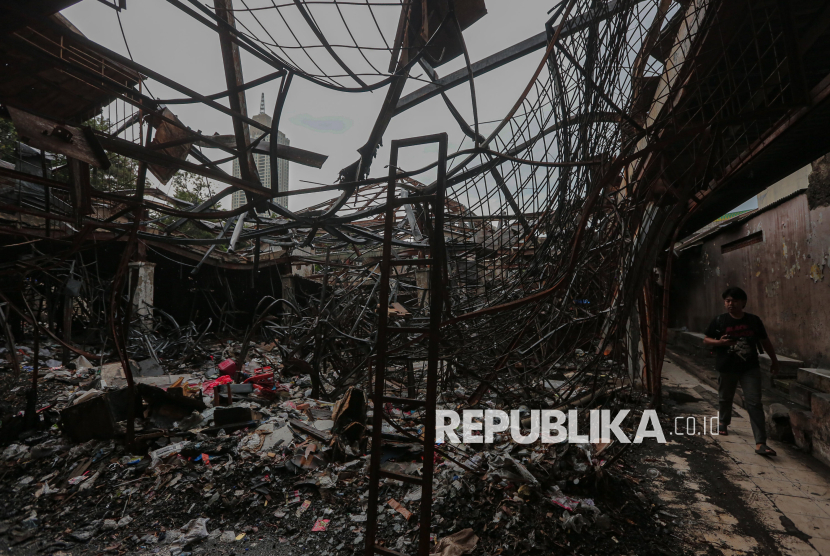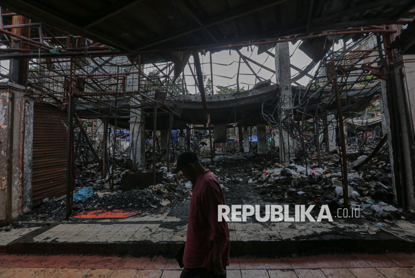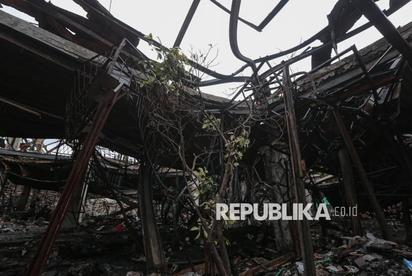 Suasana Pasar Taman Puring yang hangus terbakar di Jakarta, Kamis (23/10/2025). Pascakebakaran pada bulan Juli 2025 lalu, revitalisasi Pasar Taman Puring tak kunjung diperbaiki. Menurut Gubernur DKI Jakarta Pramono Anung, pasar tersebut akan segera direvitalisasi setelah ada kesepakatan diantara seluruh pedagang, agar proses revitalisasi dapat berjalan dengan lancar. (FOTO : Republika/Thoudy Badai)