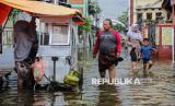 Warga berjalan di jalan yang terendam banjir di area permukiman rumahnya di Jalan Tambakrejo, Kelurahan Kaligawe, Semarang, Jawa Tengah, Sabtu (25/10/2025). Berdasarkan data BPBD Kota Semarang per Sabtu (25/10) sebanyak 8.180 jiwa dari 3.324 KK di 10 kelurahan dan delapan titik jalan raya di kota itu masih terdampak banjir dengan ketinggian bervariasi dari 10-60 centimeter akibat intensitas hujan tinggi yang masih melanda sejak Selasa (21/10). (FOTO : ANTARA FOTO/Makna Zaezar)