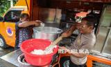 Anggota polisi dan relawan memasak nasi di dapur umum untuk korban banjir di tenda darurat Kantor Kecamatan Gayamsari, Semarang, Jawa Tengah, Sabtu (25/10/2025). Dapur umum yang didirikan di sejumlah titik oleh Badan Penanggulangan Bencana Daerah (BPBD) bersama Polri, TNI dan Pemkot Semarang itu untuk menyediakan berbagai makanan siap saji dan berprotein dengan total 1.500 bungkus paket nasi setiap harinya dalam membantu meringankan beban masyarakat yang terdampak banjir di kota itu sejak Rabu (22/10). (FOTO : ANTARA FOTO/Makna Zaezar)