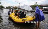 REPUBLIKA.CO.ID, SEMARANG -- Sejumlah warga menggunakan perahu karet untuk melintasi banjir yang merendam Jalan Raya Tambakrejo, Kelurahan Kaligawe, Semarang, Jawa Tengah, Sabtu (25/10/2025).