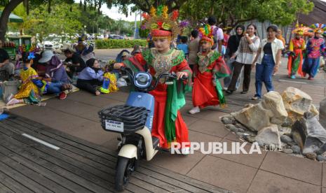 Sejumlah peserta bermain sebelum mengikuti acara Semarak Nandak Ondel-ondel Betawi yang berlangsung di Symphony of The Sea, Ancol, Jakarta, pada Sabtu (25/10/2025). Kegiatan Semarak Nandak Ondel-ondel Betawi yang melibatkan lebih dari 2.000 penari dari Indonesia dan mancanegara tersebut digelar dalam rangka pemecahan rekor MURI serta menjadi bagian dari memeriahkan penyelenggaraan 4th Indonesia International Culture Festival (IICF) 2025. (FOTO : undefined)