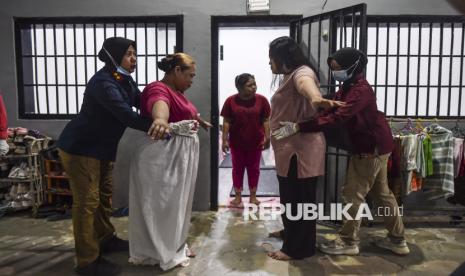 Kepala Lembaga Pemasyarakatan (LPP) Kelas II B Jambi Meita Eriza (kiri) dan petugas memeriksa warga binaan pemasyarakatan (WBP) saat razia di LPP Kelas II B Jambi, Muaro Jambi, Jambi, Sabtu (25/10/2025). Razia yang juga melibatkan aparat kepolisian dan TNI di lapas perempuan dengan 60 persen WBP merupakan kasus narkoba tersebut bertujuan mengantisipasi peredaran narkoba dan barang-barang berbahaya lain di dalam lapas. (FOTO : ANTARA FOTO/Wahdi Septiawan)