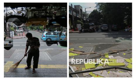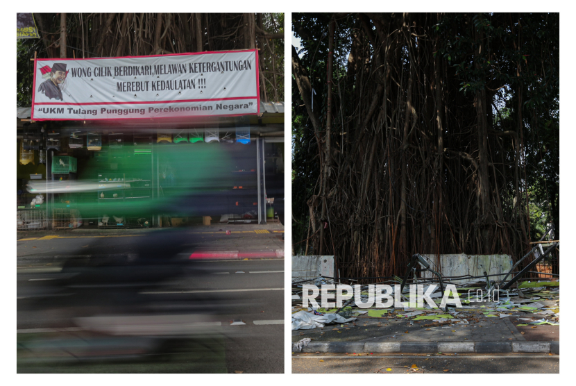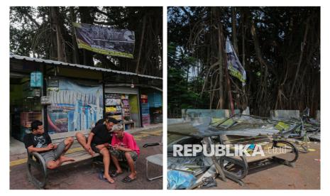 Foto kolase sebelum dan sesudah pembongkaran kios di Pasar Hewan Barito, Jakarta, Senin (27/10/2025). Pemerintah Provinsi DKI Jakarta menggusur kios pedagang Pasar Barito untuk proyek pembangunan Taman Bendera Pusaka. Para pedagang akan direlokasi ke Sentra Fauna Lenteng Agung karena dinilai memiliki sarana dan prasarana yang memadai. Meski demikian, sejumlah pedagang menyayangkan tindakan penggusuran tersebut dilakukan tanpa proses mediasi dengan para pedagang. (FOTO : Republika/Thoudy Badai)