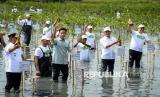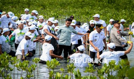 REPUBLIKA.CO.ID, TANGERANG -- Wakil Presiden Gibran Rakabuming Raka bersama Menteri Lingkungan Hidup Hanif Faisol Nurofiq, Wakil Menteri Lingkungan Hidup Diaz Hendropriyono dan Gubernur Banten Andra Soni menanam bibit mangrove saat mengunjungi Taman Mangrove Ketapang di Mauk, Kabupaten Tangerang, Banten, Senin (27/10/2025).