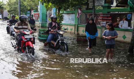 Pengendara sepeda motor melintasi banjir yang merendam di area permukiman warga di kawasan Jalan Dong Biru, Genuk, Semarang, Jawa Tengah, Senin (27/10/2025). Banjir yang melanda Kota Semarang sejak Rabu (22/10) berangsur surut namun sejumlah titik permukiman warga di wilayah tersebut masih terendam dengan ketinggian air 10-40 centimeter dari sebelumnya mencapai 60 centimeter. (FOTO : ANTARA FOTO/Makna Zaezar)