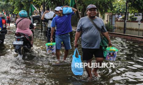 Sejumlah warga korban banjir membawa bantuan berupa paket sembako di kawasan Kantor Kecamatan Genuk, Semarang, Jawa Tengah, Senin (27/10/2025). Pemerintah Provinsi Jawa Tengah menyalurkan bantuan untuk warga terdampak banjir di Semarang senilai Rp410,4 juta yang terdiri dari logistik permakanan dan non-makanan termasuk beras 2,5 ton serta obat-obatan sebagai upaya meringankan beban sekaligus memberi semangat kepada korban banjir. (FOTO : ANTARA FOTO/Makna Zaezar)