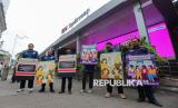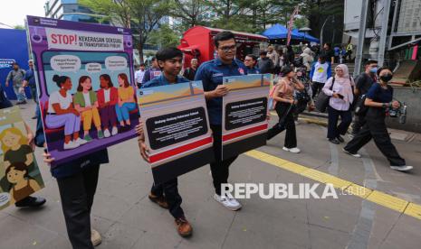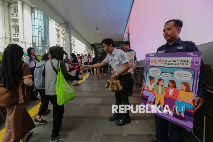 Petugas KAI Commuter membawa poster saat menggelar Kampanye Anti Kekerasan Seksual di Stasiun Manggarai, Jakarta, Selasa (28/10/2025). KAI Commuter menggelar Kampanye Anti Kekerasan Seksual guna memberikan edukasi kepada seluruh pengguna Commuterline untuk lebih peduli dan berani melapor jika terjadi kasus pelecehan seksual di transportasi publik. (FOTO : Republika/Thoudy Badai)