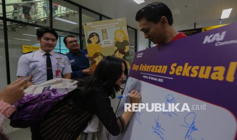 REPUBLIKA.CO.ID, JAKARTA -- Petugas KAI Commuter membawa poster saat menggelar Kampanye Anti Kekerasan Seksual di Stasiun Manggarai, Jakarta, Selasa (28/10/2025).