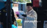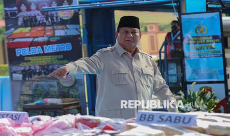 Presiden Prabowo Subianto menunjukan barang bukti narkoba sebelum dimusnahkan di Lapangan Bhayangkara, Mabes Polri, Jakarta Selatan, Rabu (29/10/2025). Barang bukti yang dimusnahkan merupakan hasil pengungkapan kasus narkotika selama periode Oktober 2024 hingga Oktober 2025, dengan total barang bukti narkoba sebanyak 214,8 ton. Dalam kegiatan tersebut, sebanyak 2,1 ton berbagai jenis narkoba dipajang untuk dimusnahkan. (FOTO : Republika/Thoudy Badai)