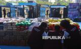 Petugas menata barang bukti narkoba di Lapangan Bhayangkara, Mabes Polri, Jakarta Selatan, Rabu (29/10/2025). Sebanyak 2,1 ton berbagai jenis narkoba dipajang untuk dimusnahkan. Barang bukti yang dimusnahkan antara lain narkotika jenis sabu, ganja hingga ekstasi. (FOTO : Republika/Thoudy Badai)