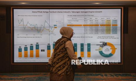 Karyawan melintas di dekat persentasi hasil kinerja saat acara penyampaian kinerja Triwulan III/2025 BSI di Kantor Pusat BSI, Jakarta ,Rabu (29/10/2025). PT Bank Syariah Indonesia Tbk (BSI) mampu membukukan kinerja yang kuat pada Triwulan III 2025 dengan perolehan laba Rp5,57 triliun. Rerata indikator kinerja keuangan BSI tumbuh dobel digit dan di atas industri disertai kualitas yang sehat. Pertumbuhan ini antara lain didorong oleh kontribusi bisnis bullion bank, yang diresmikan oleh Presiden Prabowo Subianto pada 26 Februari 2025. (FOTO : Republika/Prayogi)